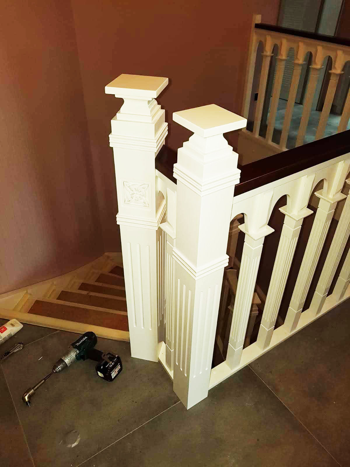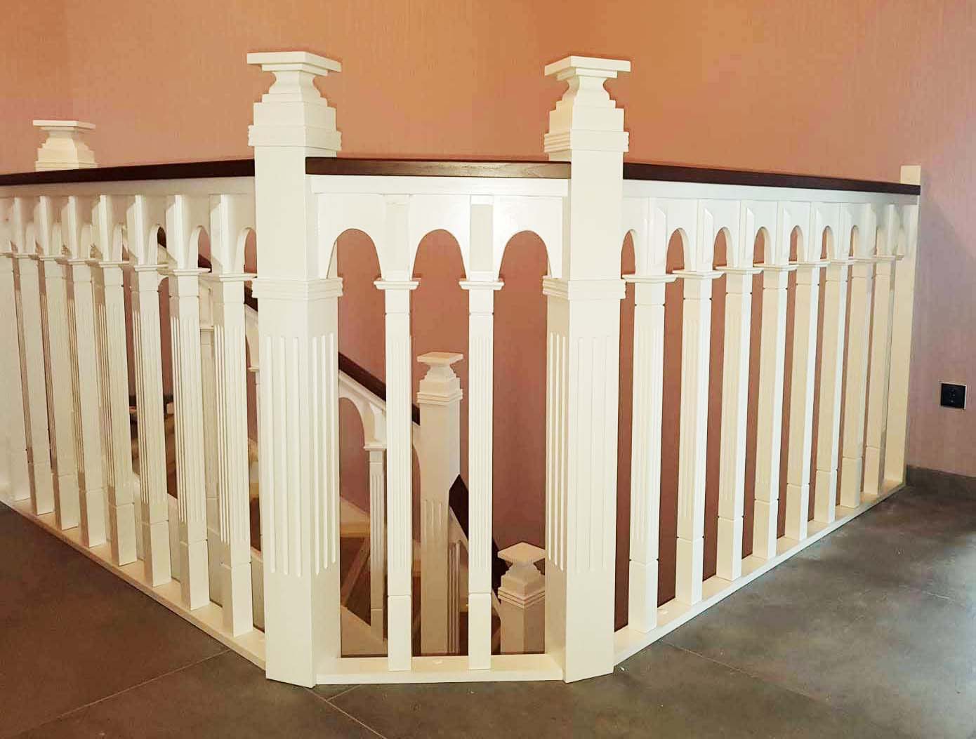 Våre ansatte har tatt de nødvendige oppmålingene, designeren har prosjektert og fabrikken har utført ideen og levert ut til kunden. Vi har laget en elegant konstruksjon som tar frem elegansen i huset. Håndløperen og trapperekkverk fortjener vår oppmerksomhet. De er definitivt mer massive enn de som vanligvis monteres. Det hele er laget i hvit, men rekkverk ble laget i mørkebrunt for å opprettholde en passende kontrast.