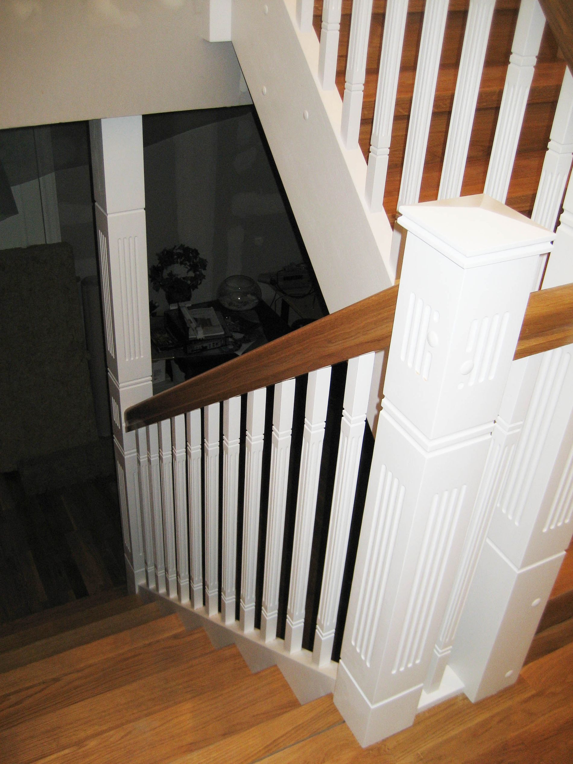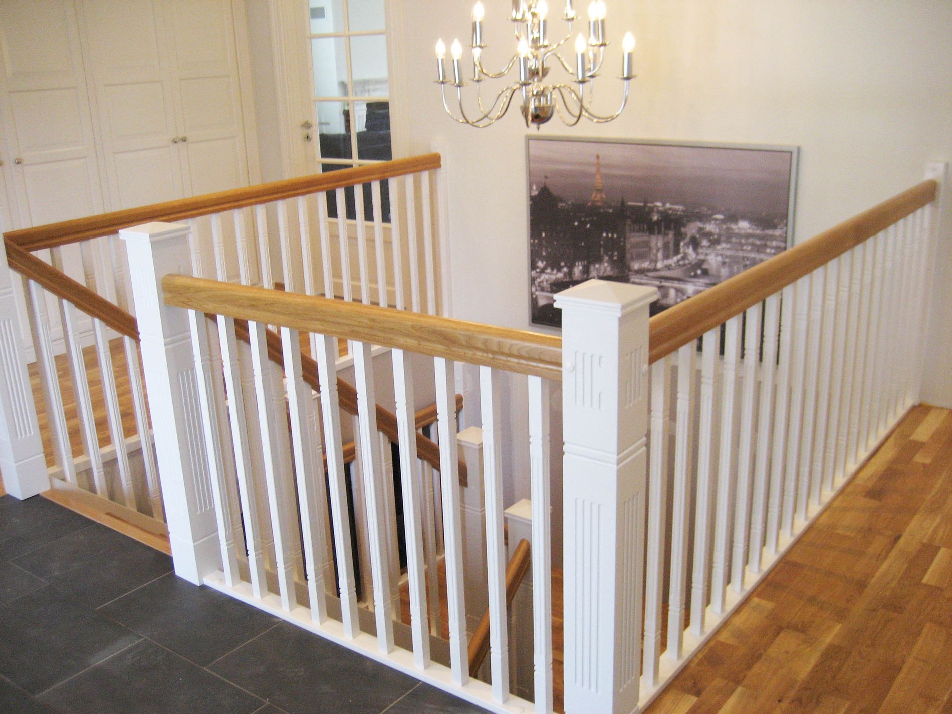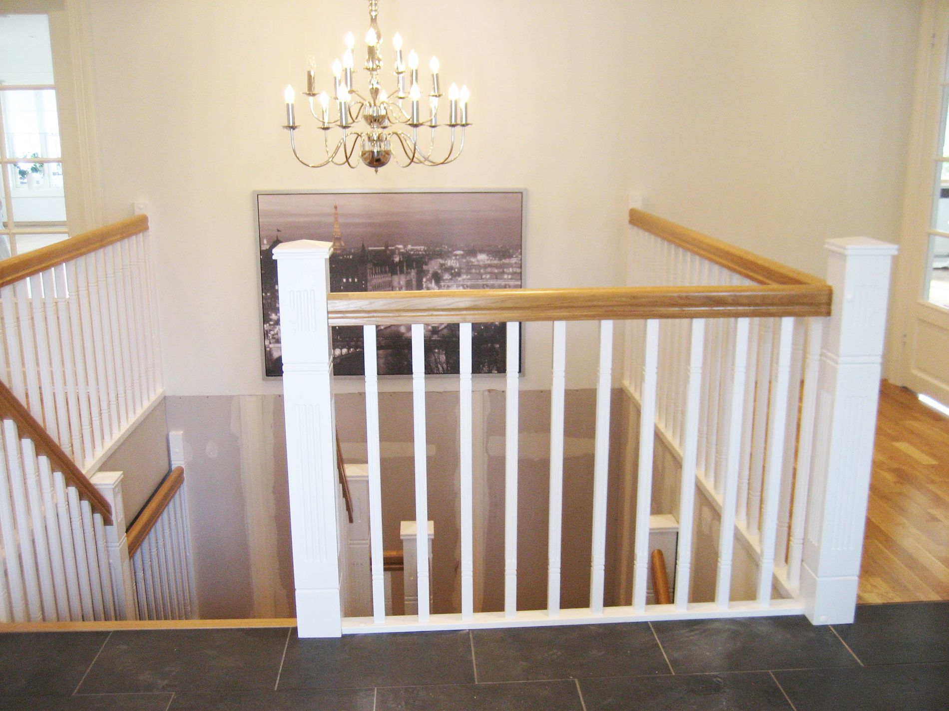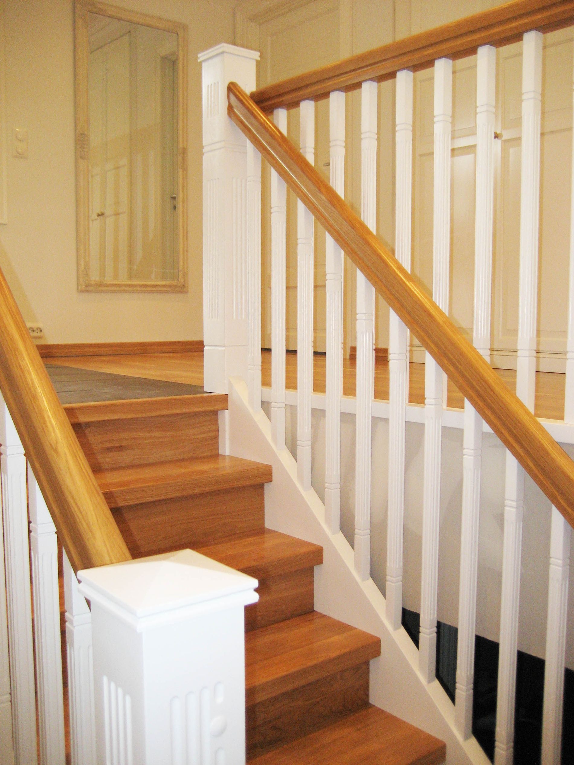 Vi inviterer deg nå til å gjøre deg kjent med den siste implementeringen av vårt firma. I motsetning til de tidligere presenterte tretrappene hvor vi kombinerer tre og glass. Deler vi i dag bilder av trapper laget i omvendt stil. Noe som gir eleganse, og samtidig et klassisk uttrykk. Trappen ble laget for en kunde i Oslo. Designen kombinerer to farger. Lysbrun farge som gjenspeiler strukturen i hjemmets gulv, og hvitt. Dette gir et resultat av kontrast og fremhever de unike tretrappene. Elementer av tre har utskjæringer som gjenspeiler husets elegante og klassiske stil. Ved å beholde tremønsteret på håndløperen, vektlegges strukturens naturlighet.