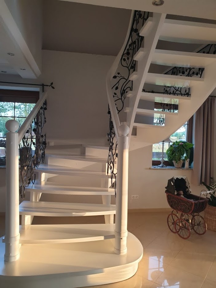 Dette er den siste utførelsen av snekkerverkstedet vårt. En av våre mest elegante design for tretrapper kombinert med jern. Trappene har en rett linje og er veldig minimalistiske. Du vil ikke finne elegante balustrader eller utskårne ornamenter på søylene. Trappene er kombinert med vakre jernrosetter som ofte refererer til naturen. Kombinasjonen av metallverk og treverk i kontrastfarger gir en fantastisk effekt av eleganse og er veldig elegant. Interiøret hvor trappene monteres får et nytt utseende og en fantastisk karakter.